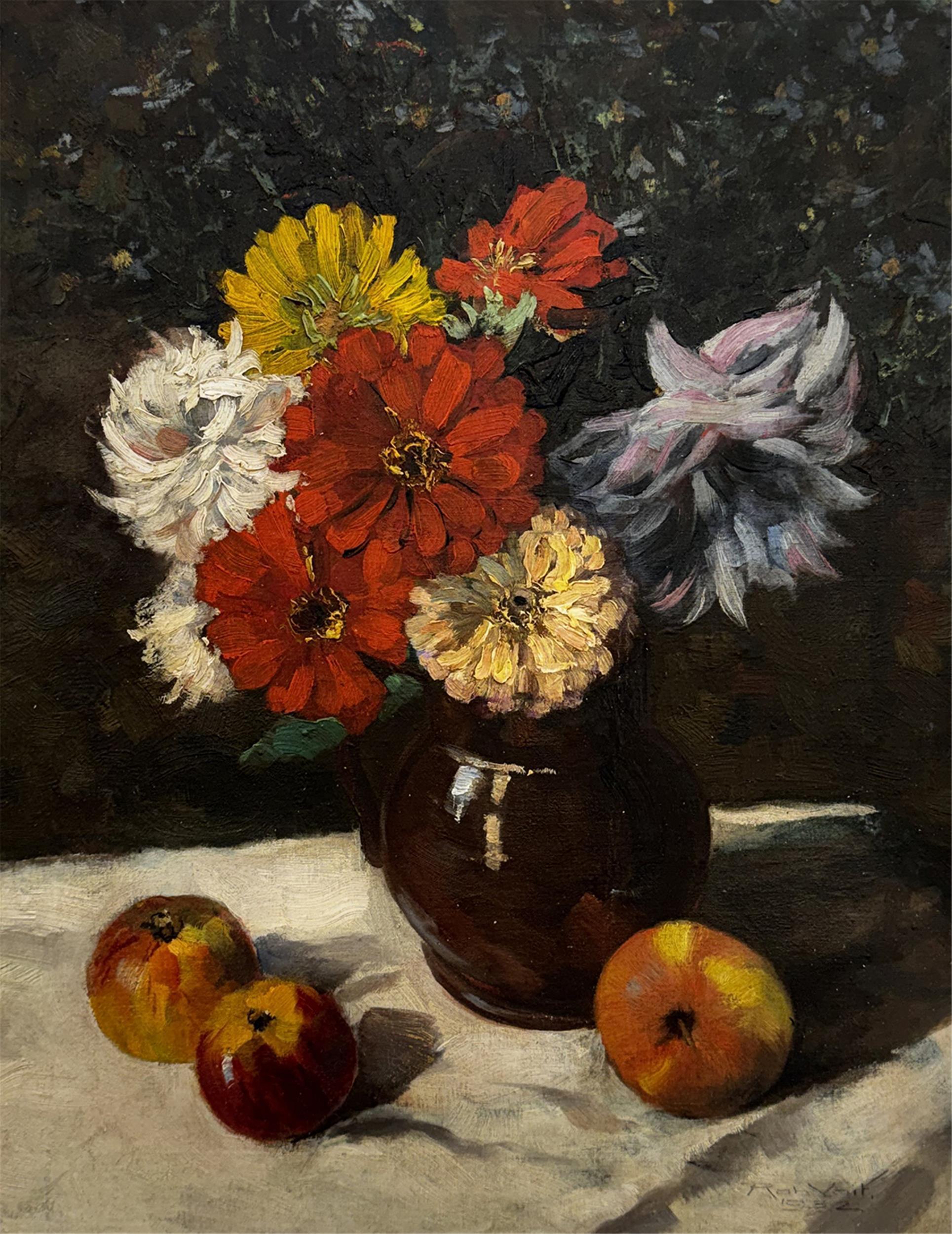Öl auf Karton, Zinnien und Äpfel, signiert Robert Voit (1889 – 1963), datiert 1932.