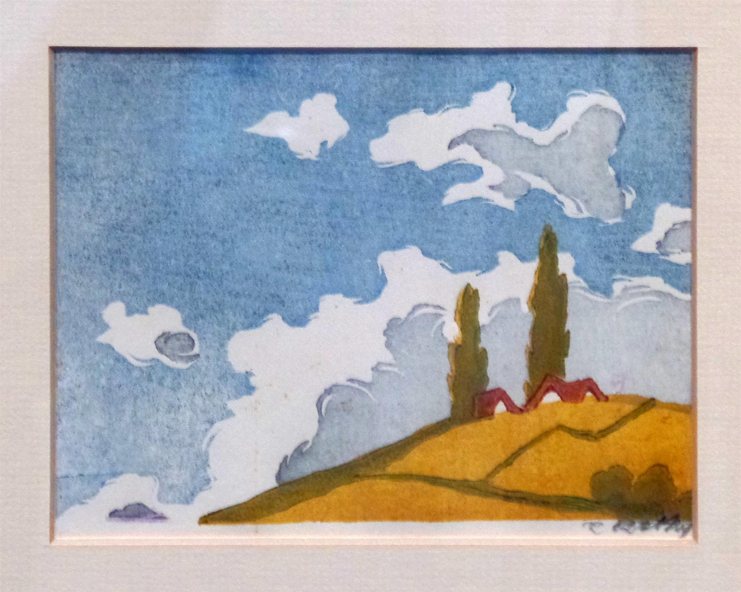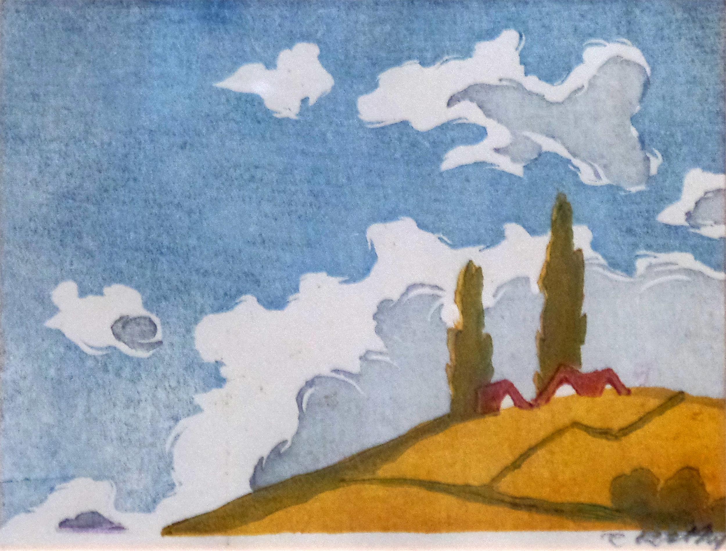 Farblinolschnitt von Carl Rotky mit einer typischen Darstellung unserer schönen südsteirischen Weingegend. Gut gerahmt.