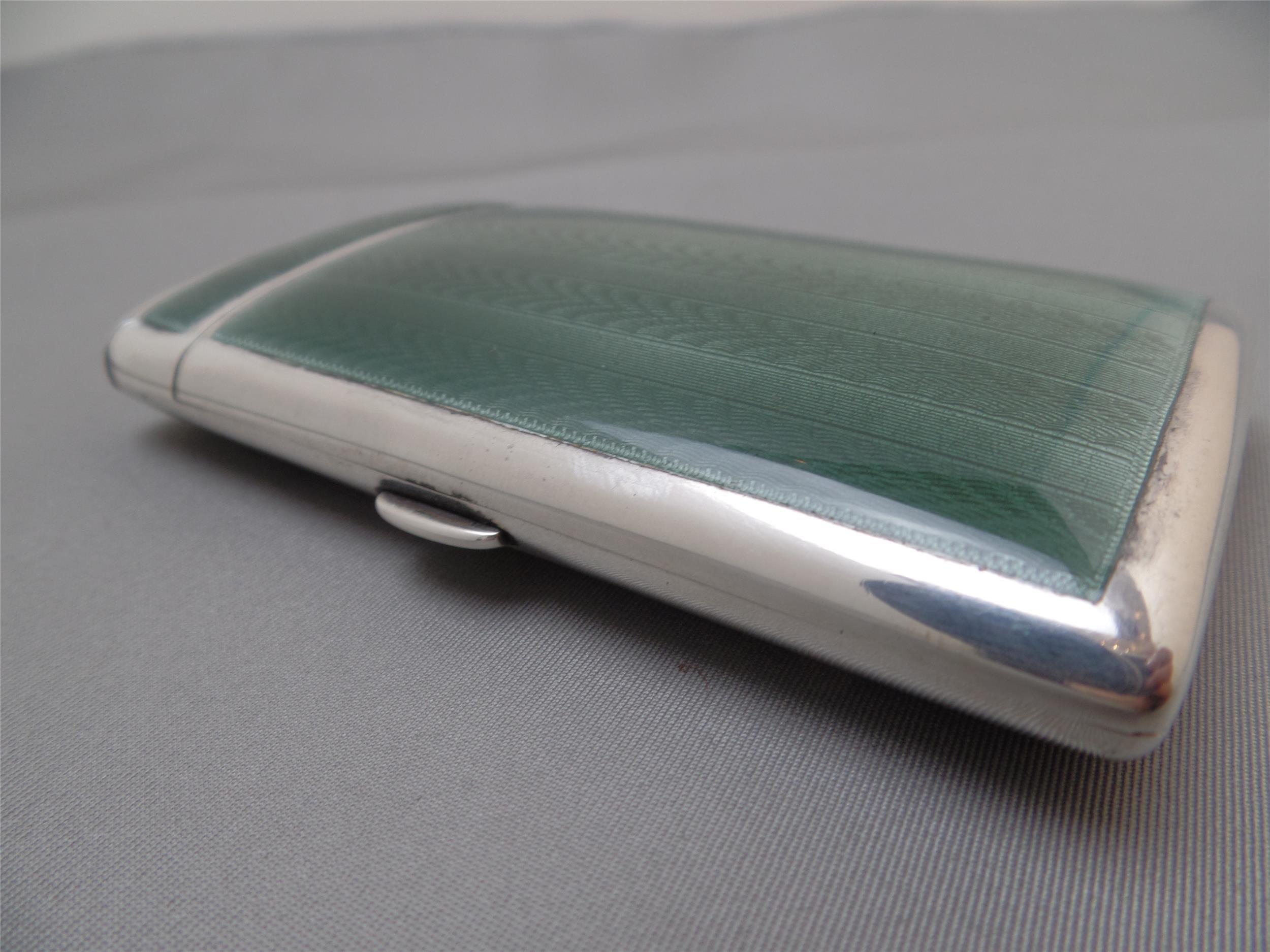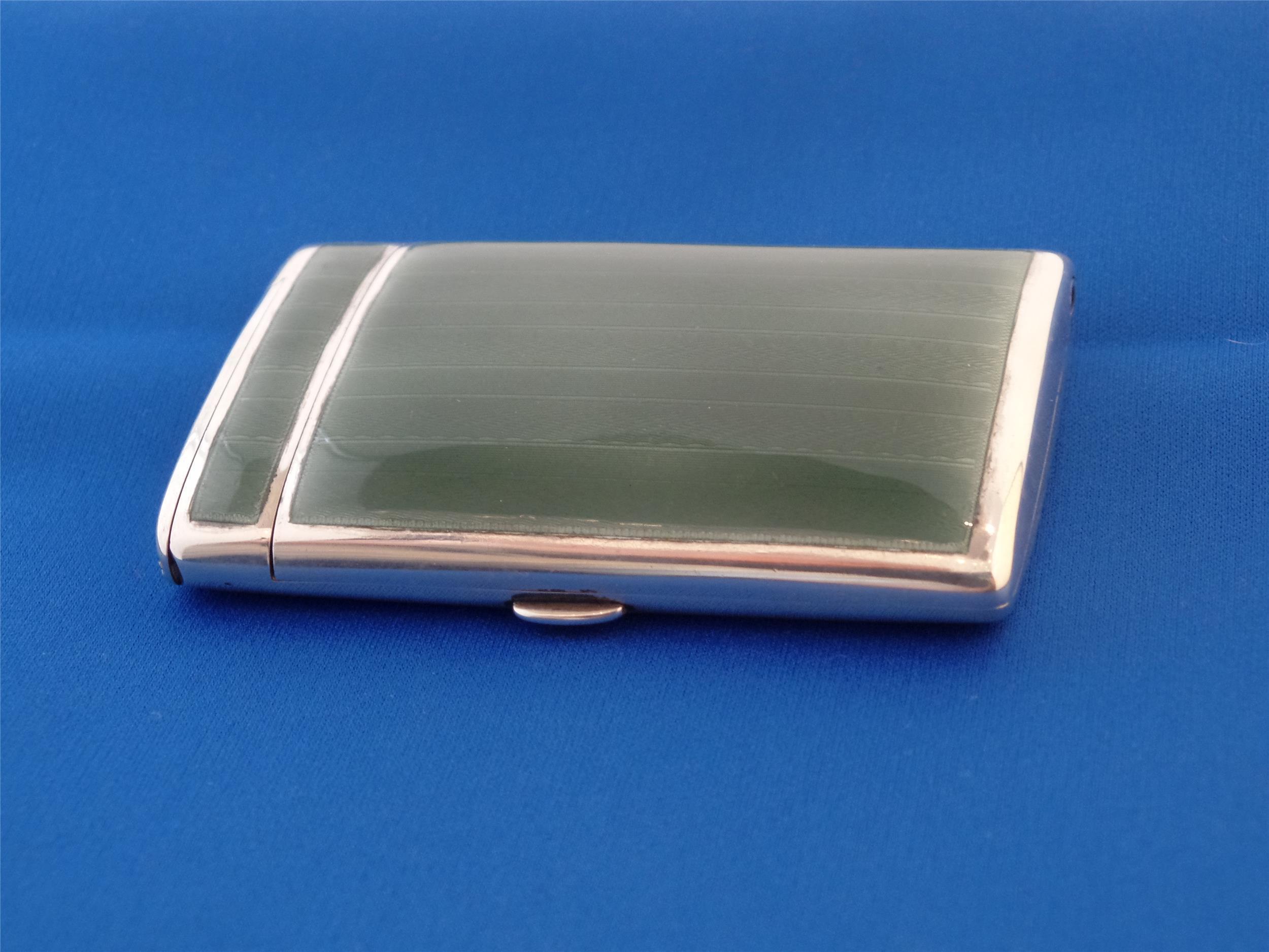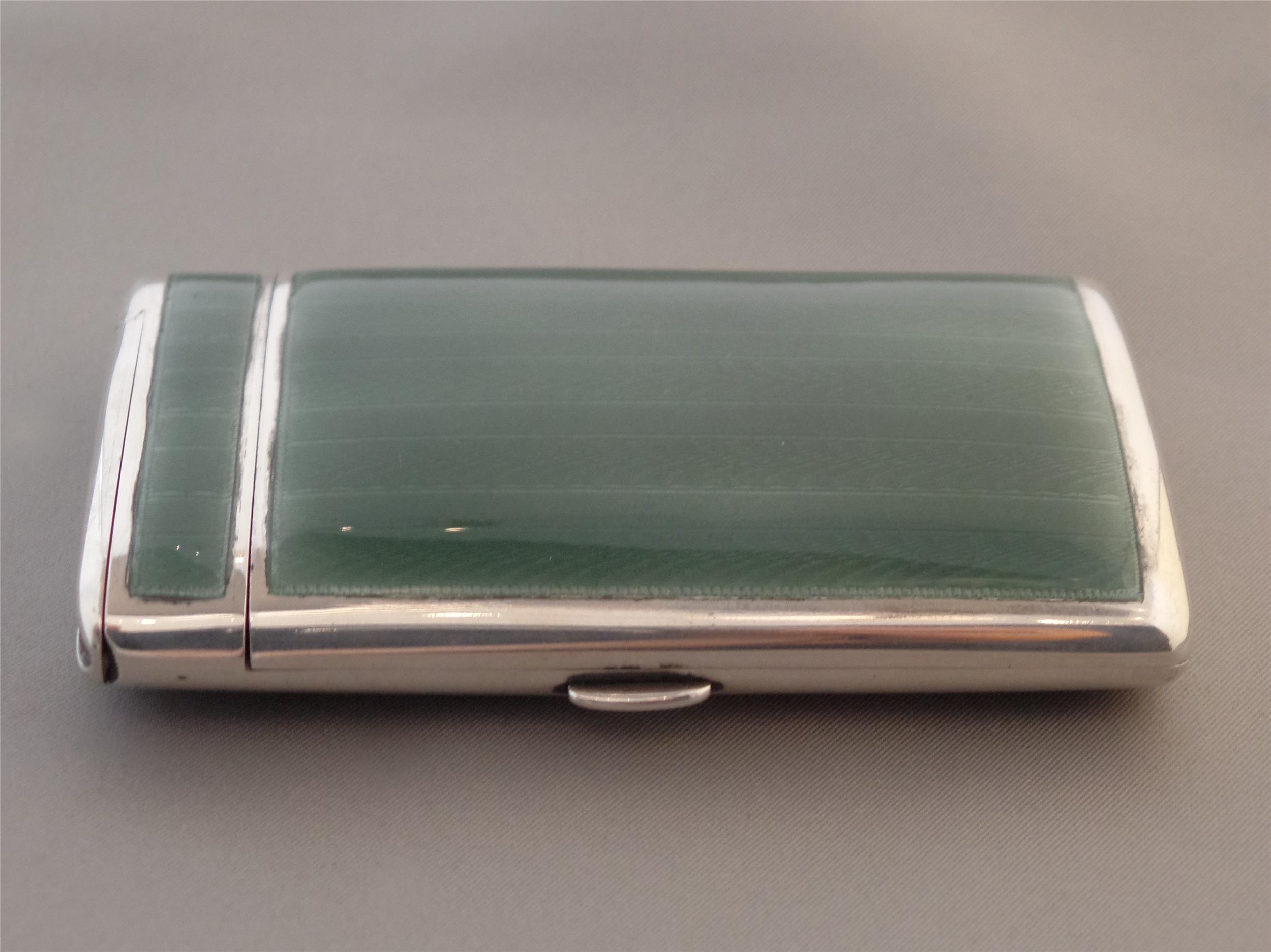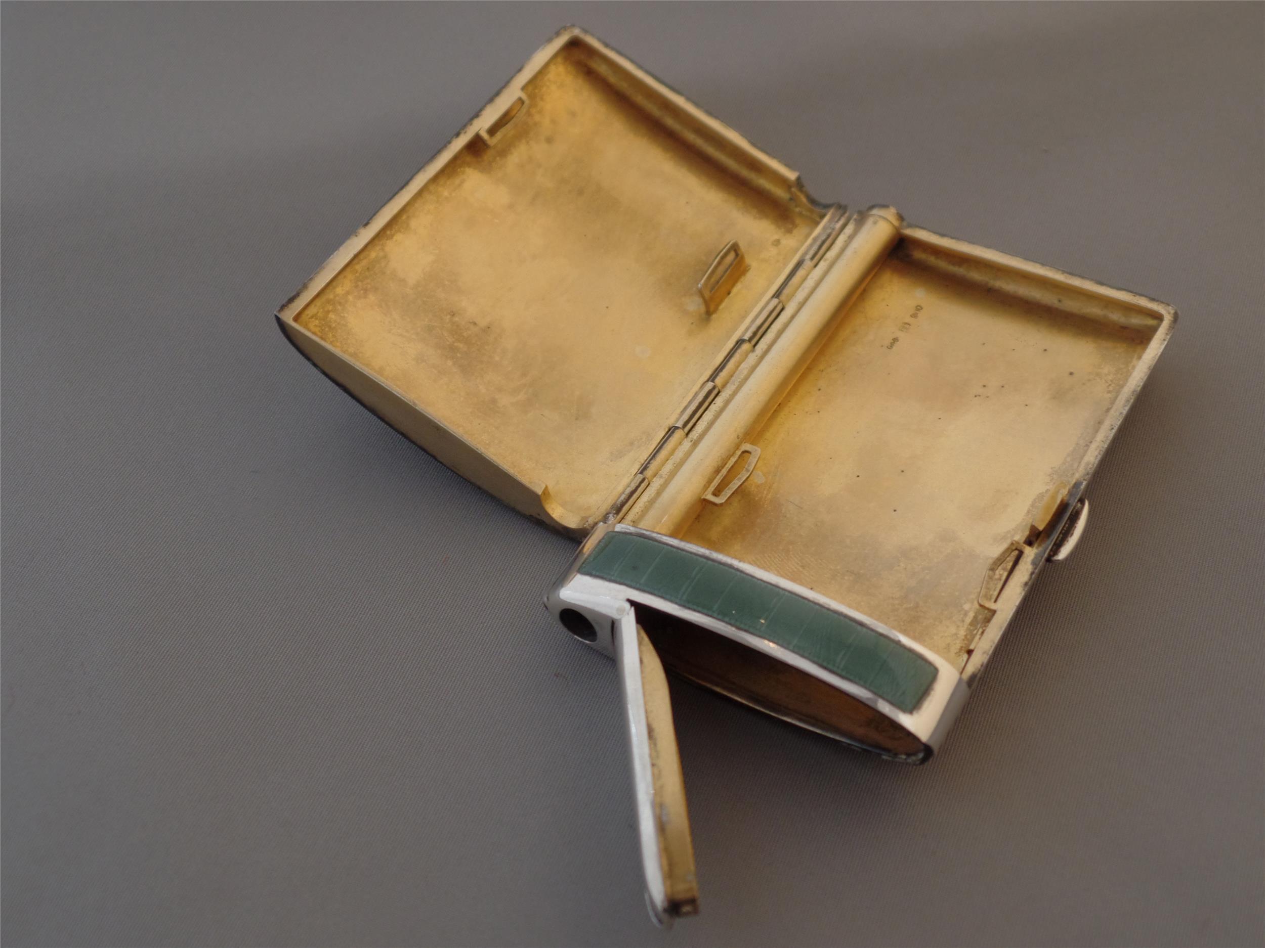 Silberne Tabatiere mit "Feuerzeug", feine Emaillierung und Innenvergoldung, Wien Anfang 20. Jahrhundert, Meistermarke Georg Adam Scheid. Es gibt einen zweiten Behälter für Streichhölzer und einer Rinne als Reibfläche, die genau auf die Führung eines Dochtes hinführt, der so entzündet wurde. Exzellente Qualität der zu seiner Zeit sehr bekannten Silberschmiede.
