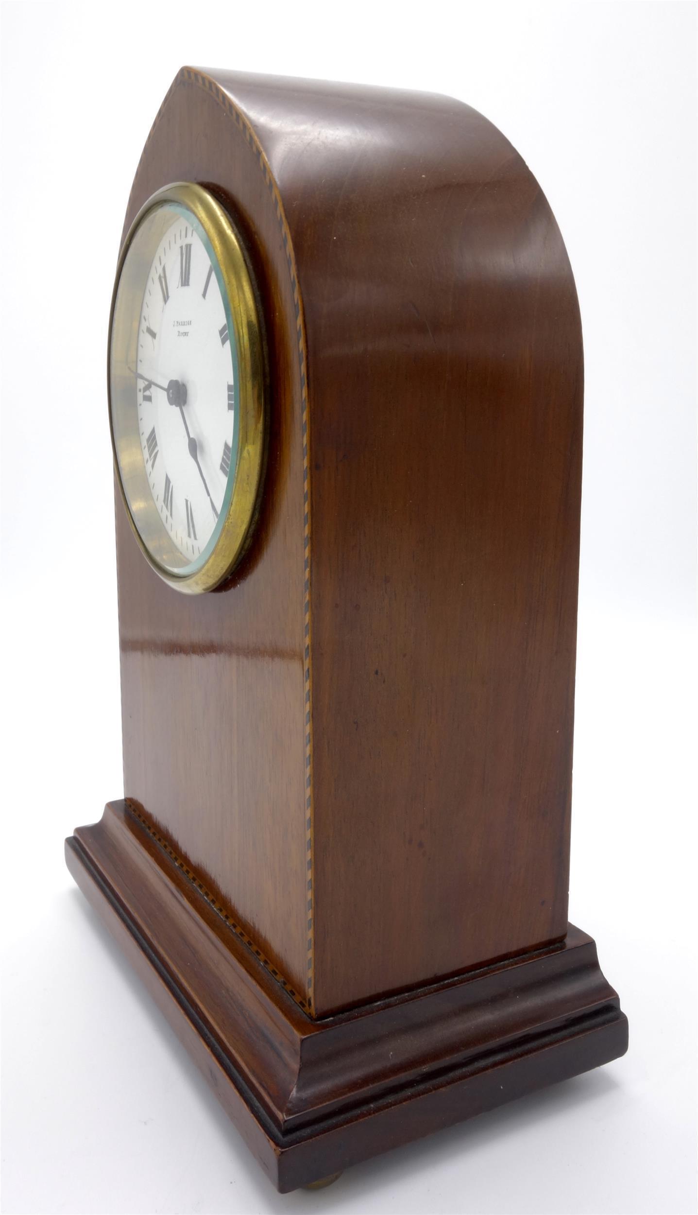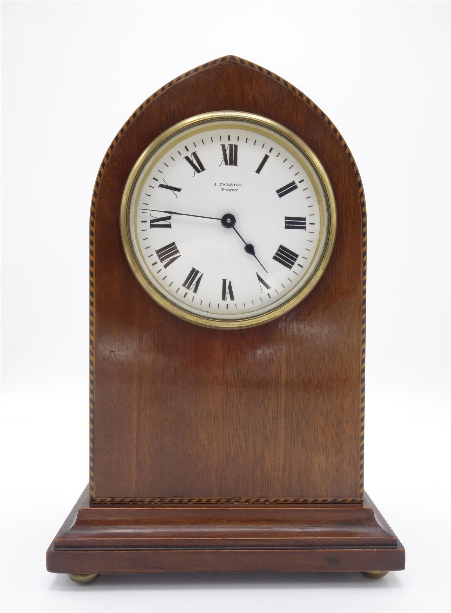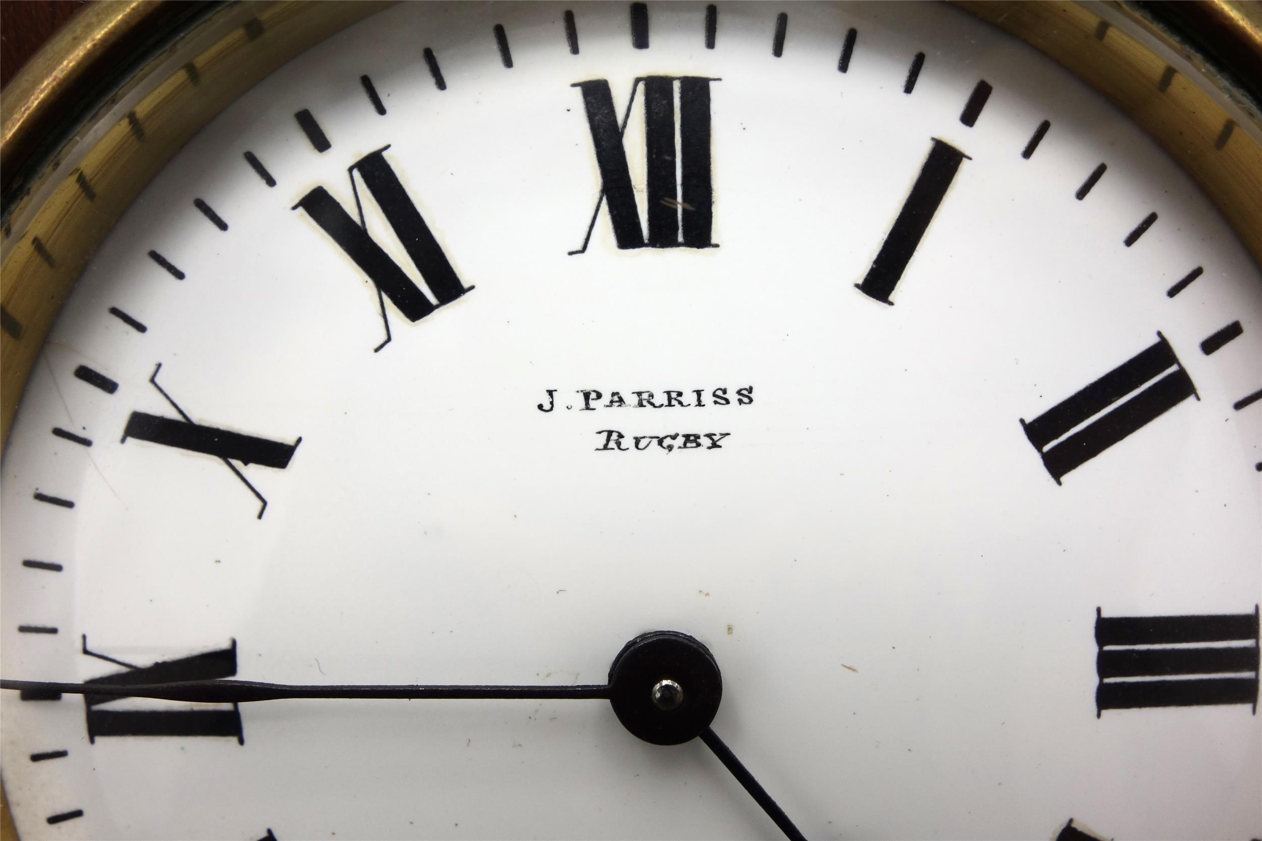 Tischuhr, signiert Joseph Parriss, Rugby, England Anfang 20.Jh., Gangdauer 8 Tage, Hemmung im Zuge einer älteren Restaurierung auf wesentlich genauere Ankerhemmung optimiert.