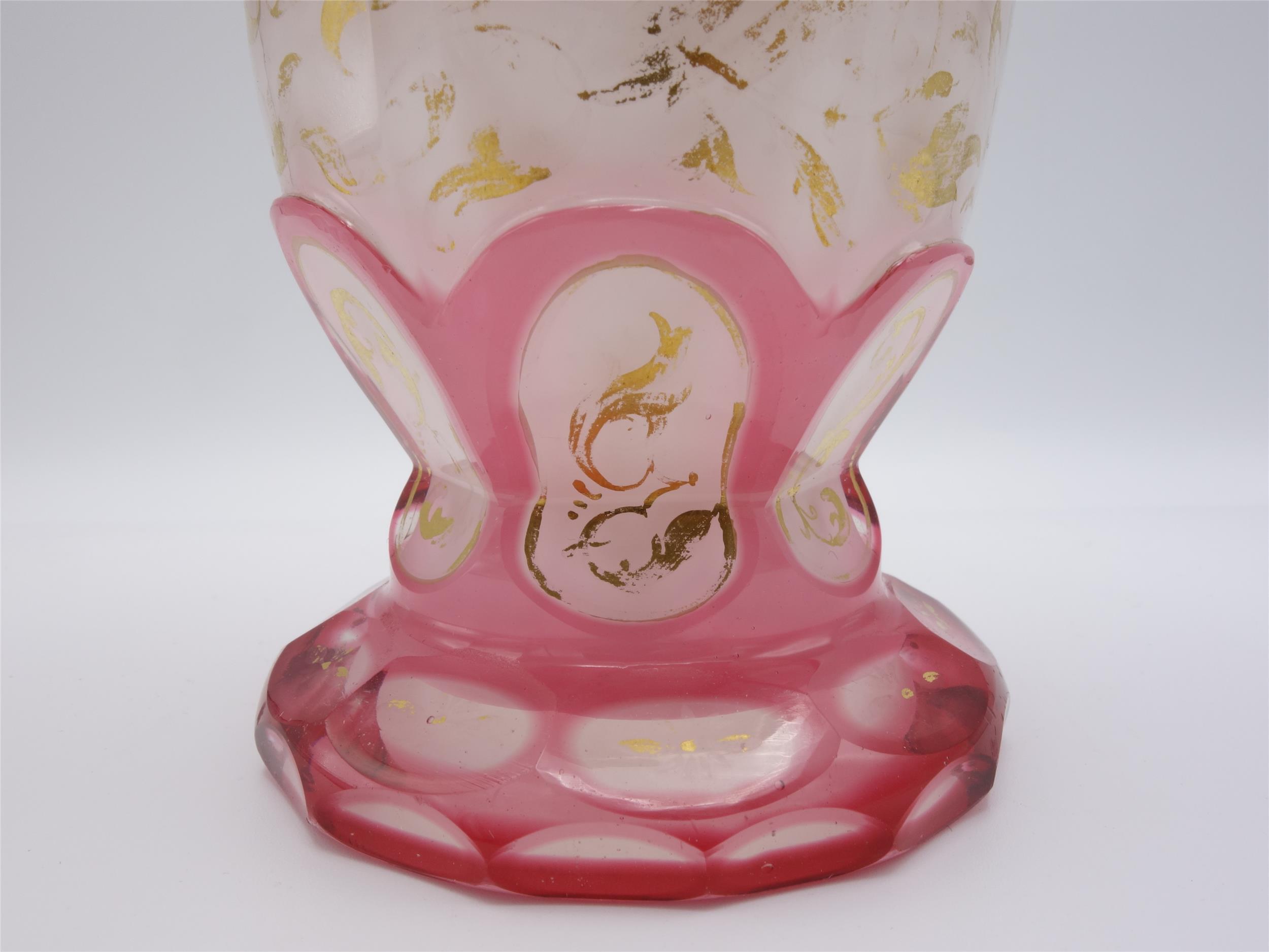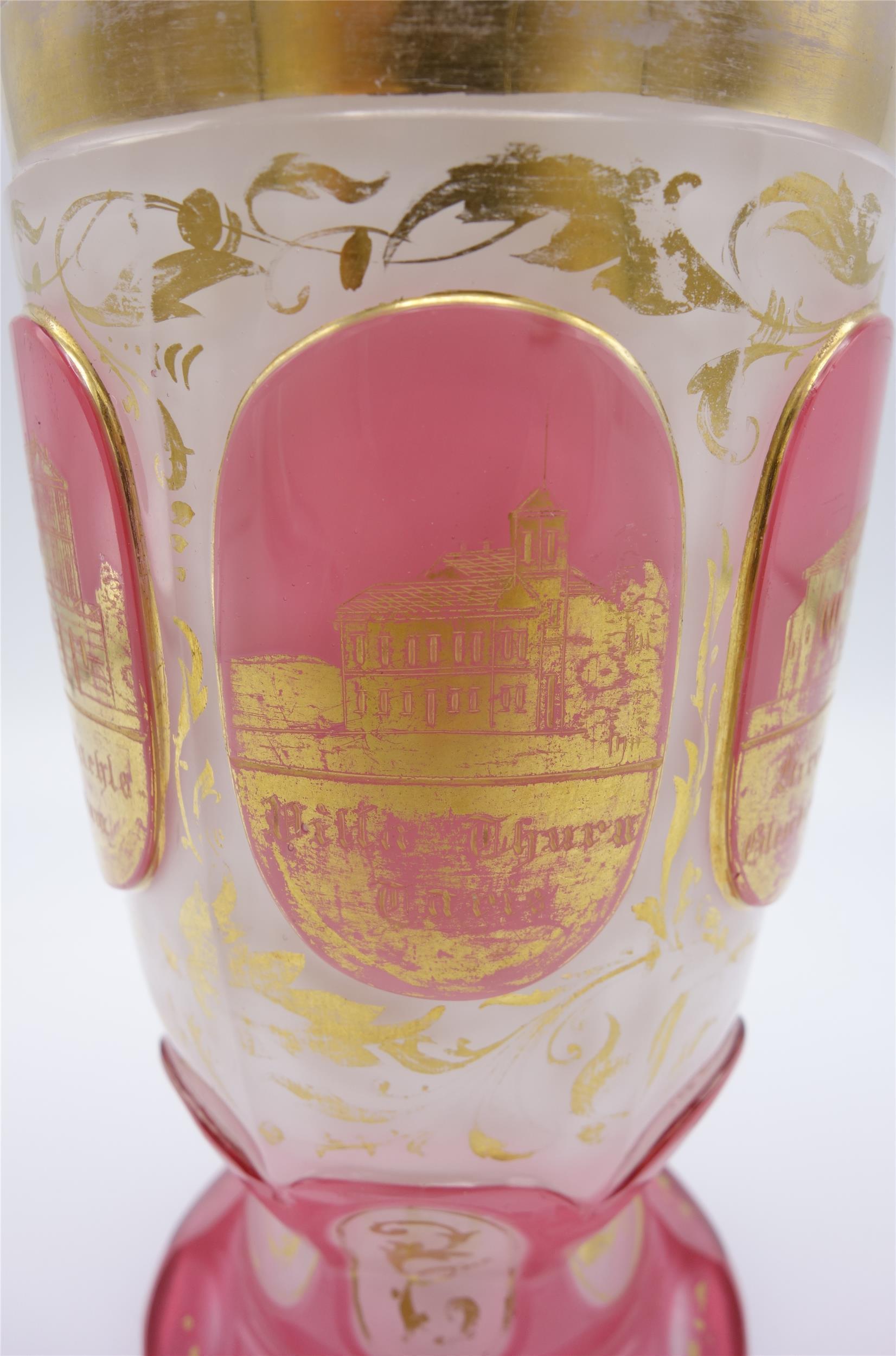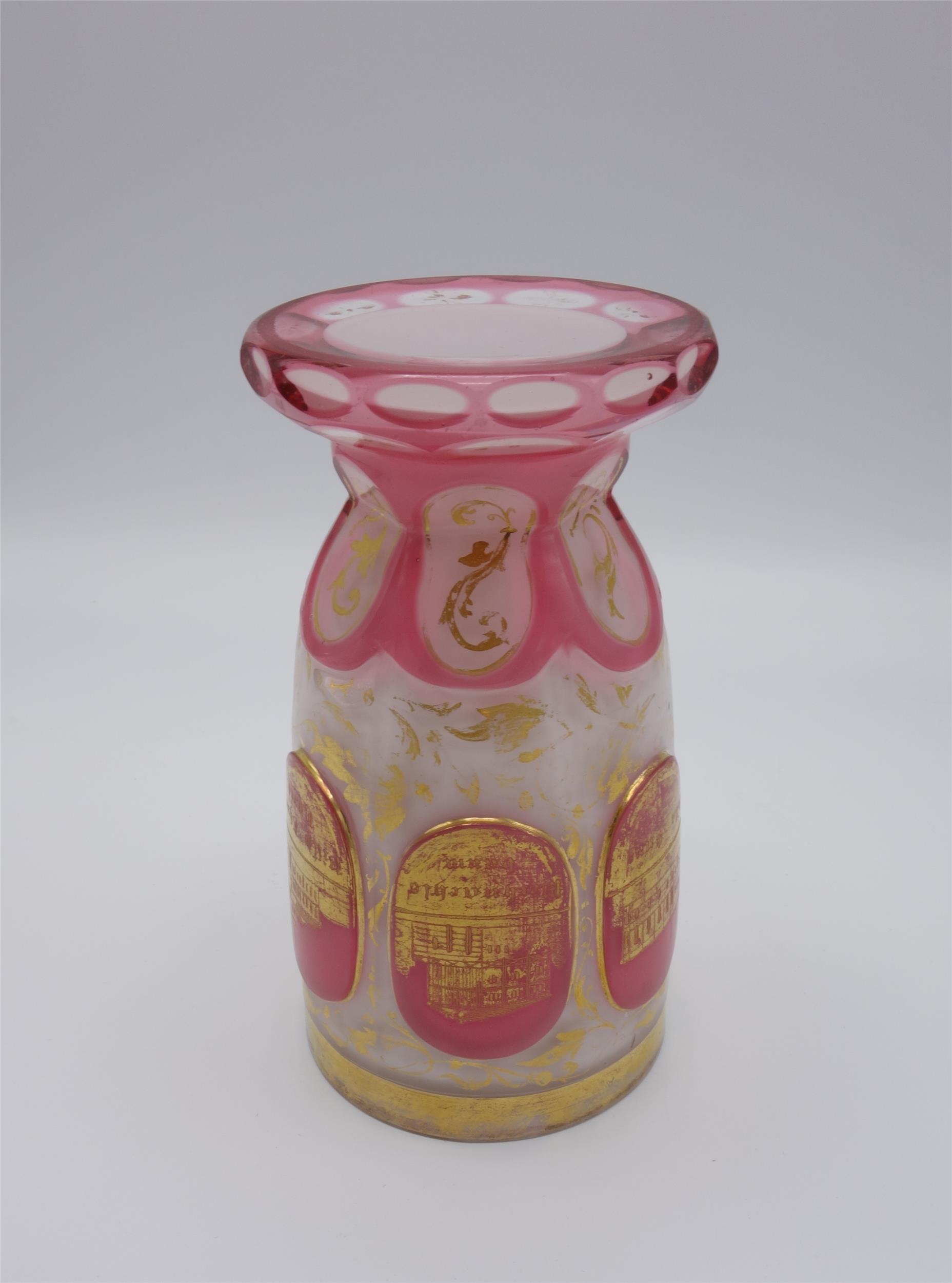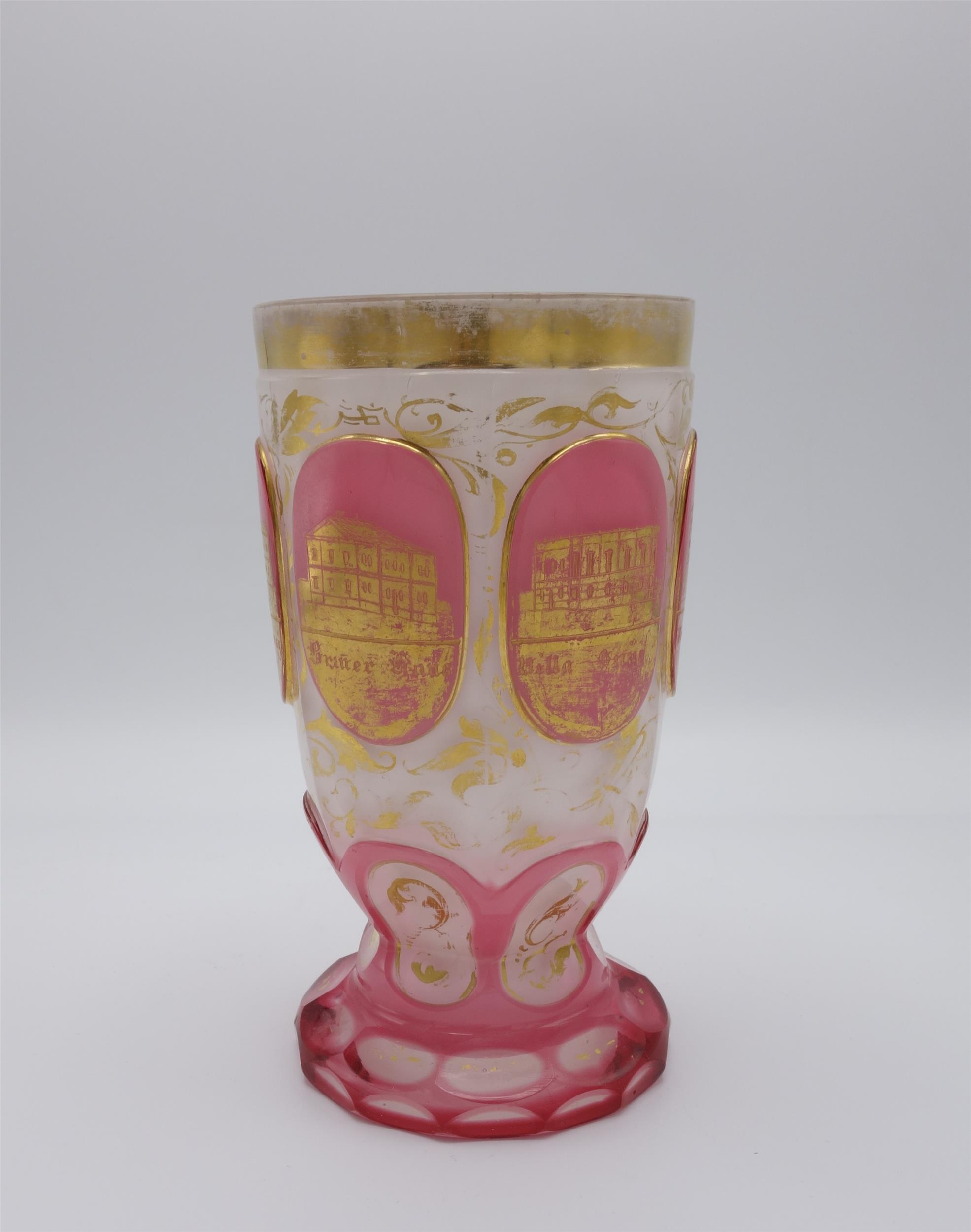Glasbecher mit doppeltem Überfang in weiß und rosa, geschliffen und vergoldet, Biedermeier, Böhmen 2. Viertel 19. Jahrhundert, in den Medaillons sechs Ansichten von Bad Gleichenberg, Vergoldung teils berieben.