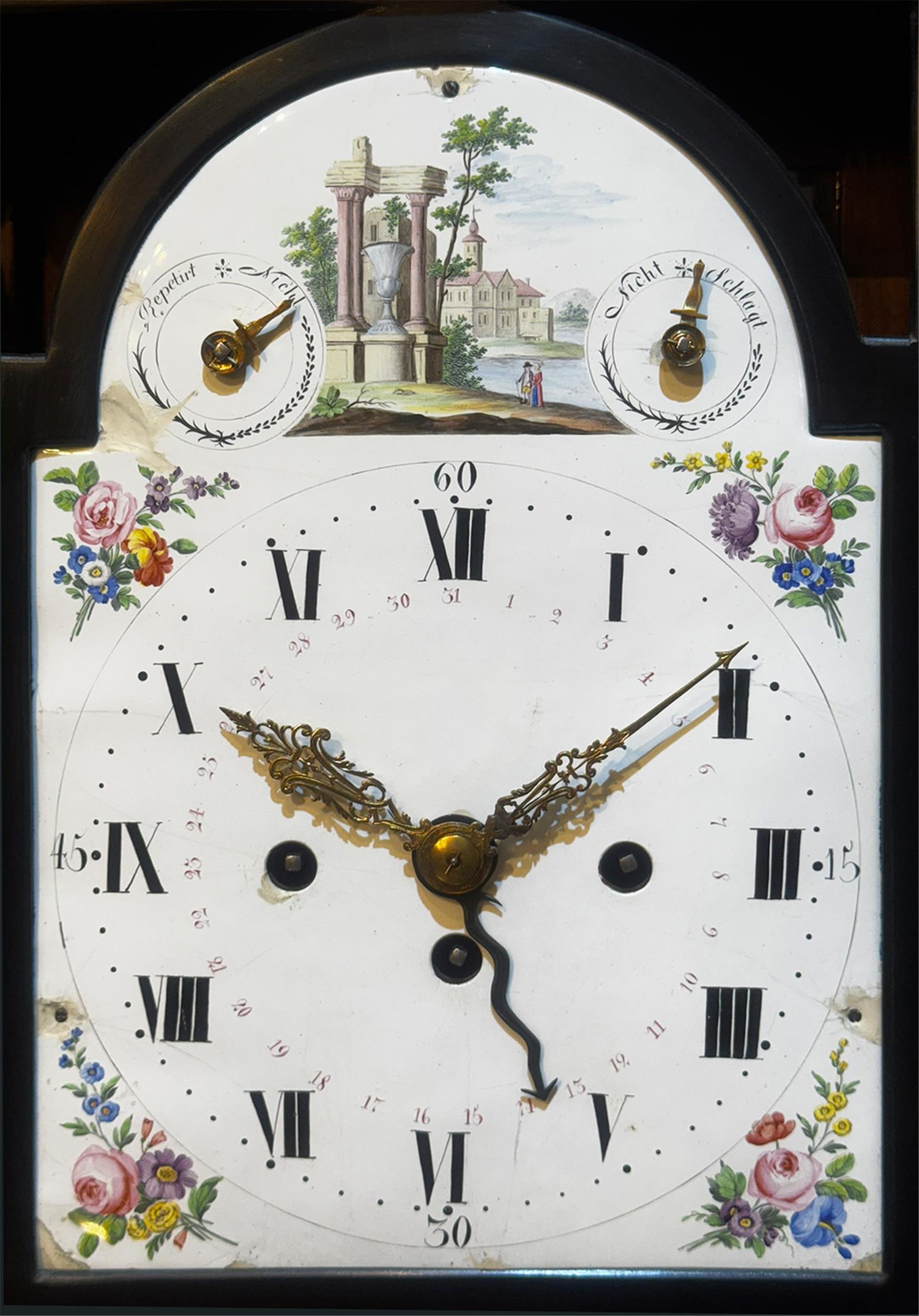 Kommodenuhr, Tageswerk mit Viertelstundenschlag auf Glocke, Datumsanzeige, Ruf und Schlagwerksabstellung, signiert Ignatzius Bayer in Cremsir, Nr. 59, Ende 18. Jahrhundert.
