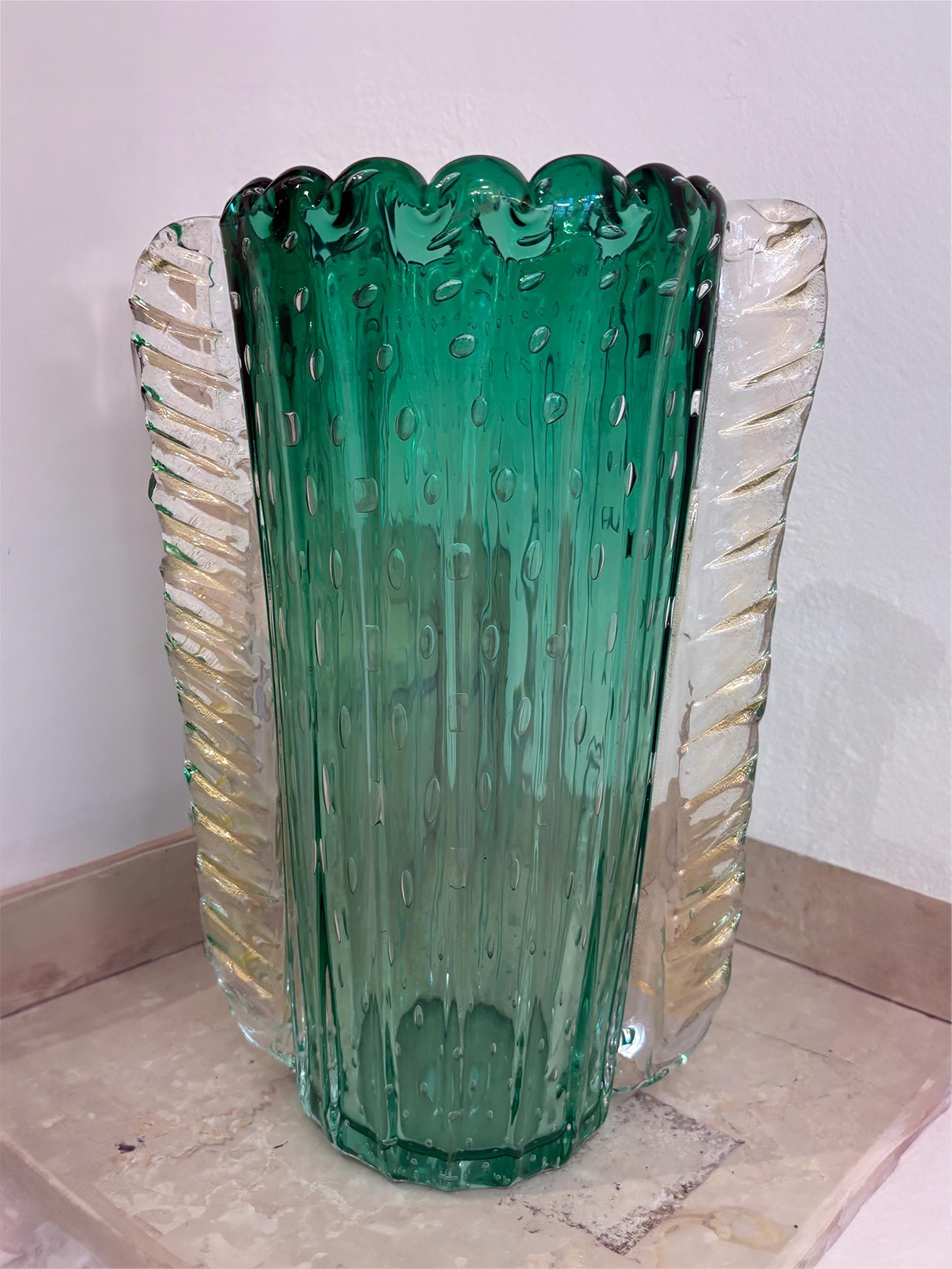Dekorative Glasvase aus der renommierten Werkstatt Barovier & Toso: Der Korpus in kräftigem Smaragdgrün wird von seitlichen, klaren Glasbahnen eingefasst, in die feine Goldfolie eingearbeitet ist.