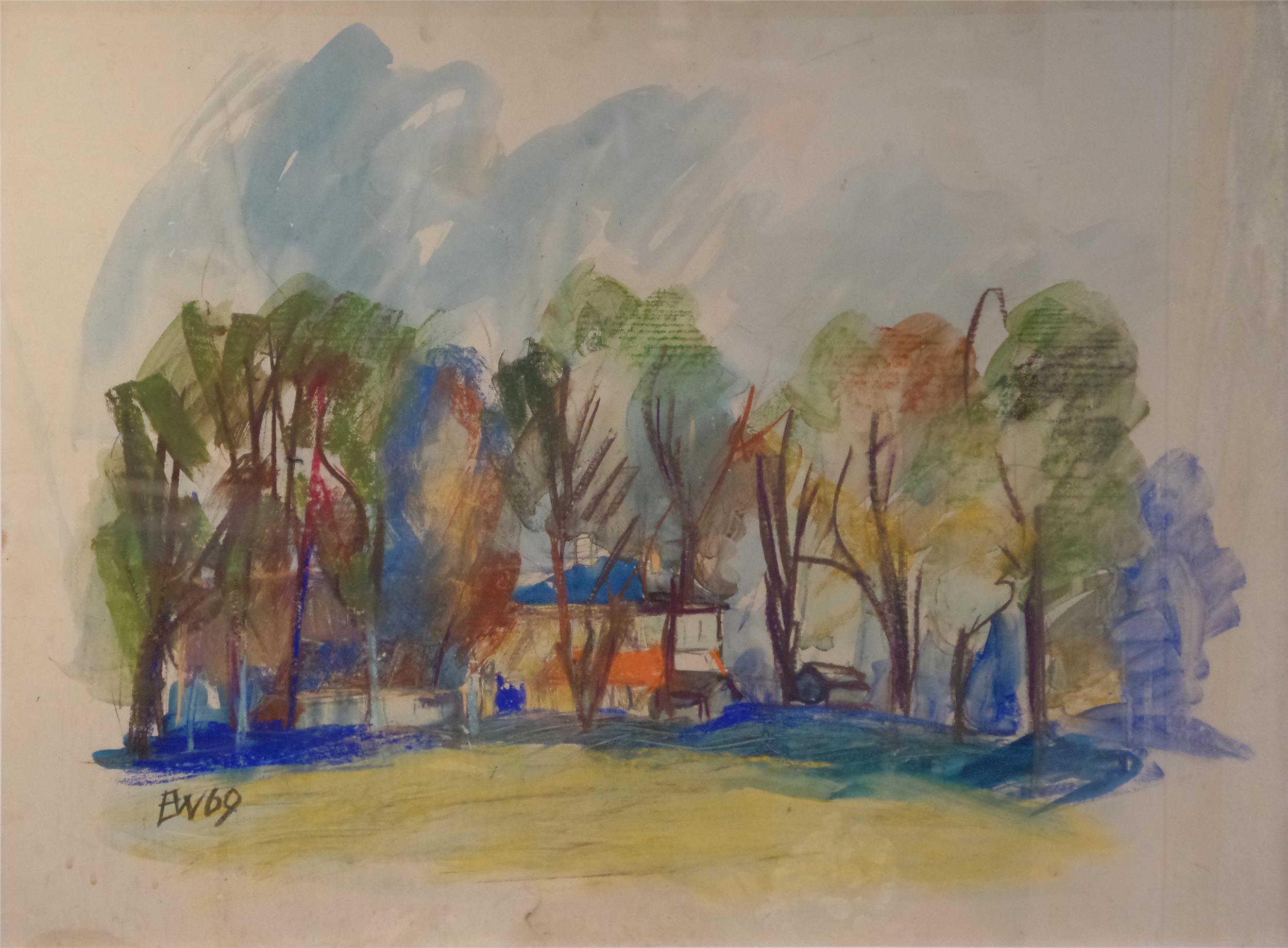 Villa im Park, Mischtechnik auf Karton, gerahmt, monogrammiert EW für Ernst Windisch (Graz 1947), datiert 1969