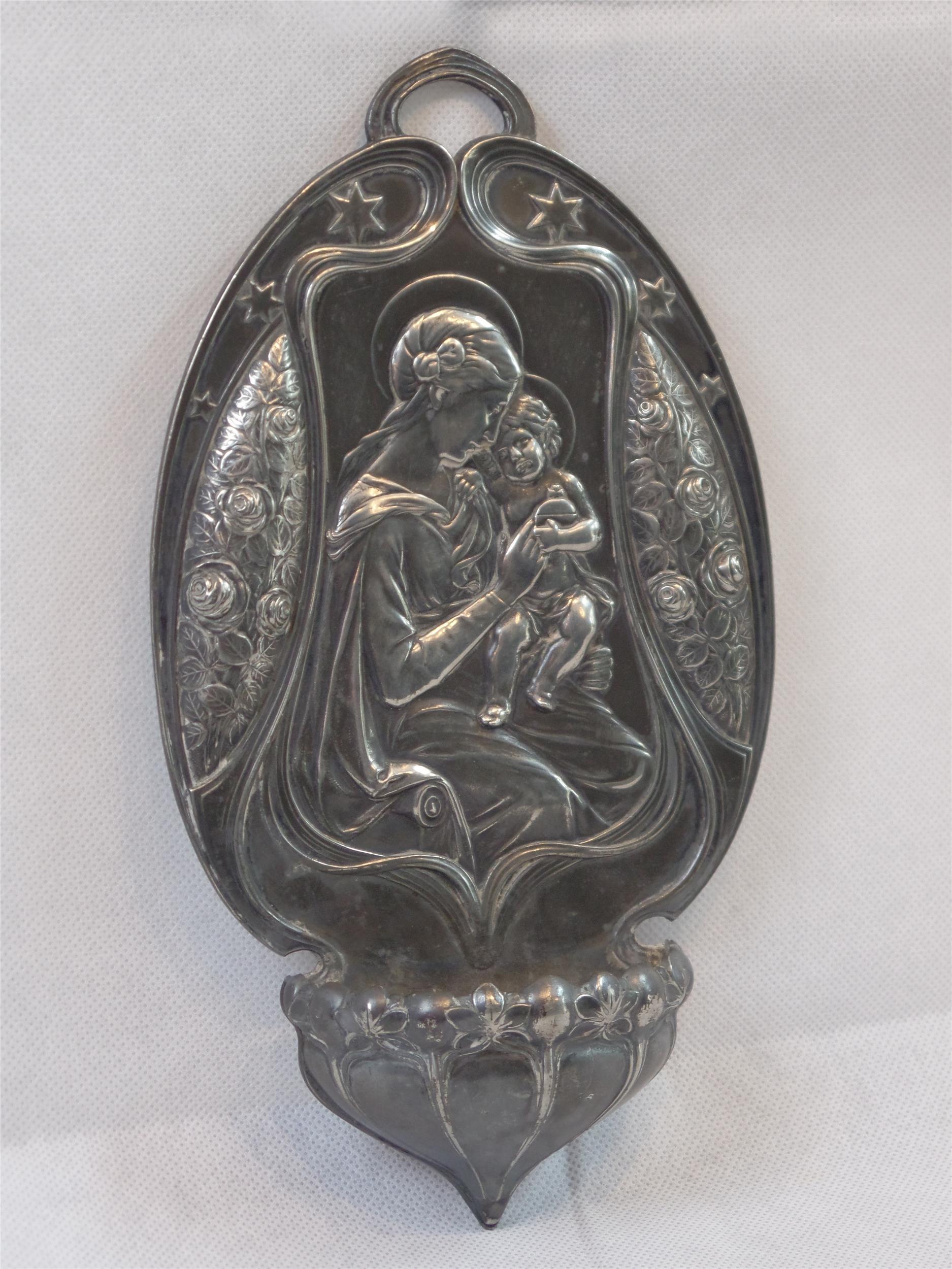 Weihwasserkessel aus Feinzinn, Anfang 20. Jahrhundert, sehr schöne Jugendstilarbeit, sehr guter Zustand.