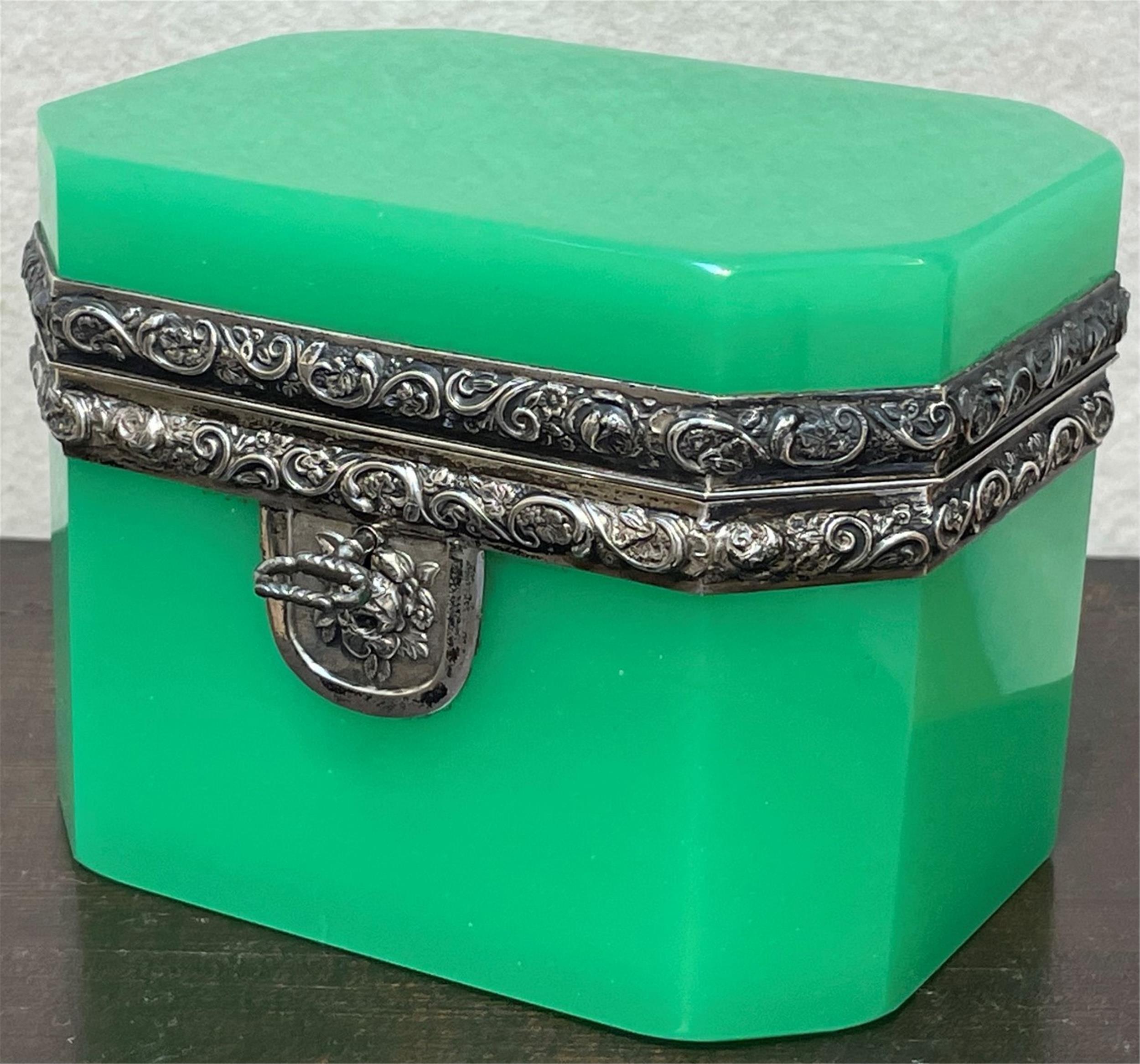 Biedermeier - Zuckerdose aus grünem Opalglas, mit Silbermontierung, Wien, um 1840, Meistermarke verschlagen, originales Schloss mit feinst gearbeitetem Schlüssel